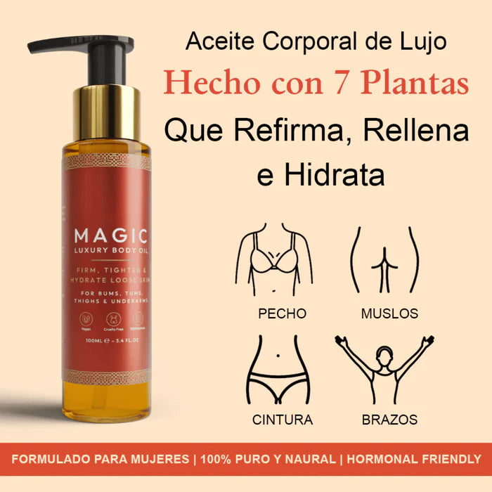 Nuestro aceite corporal de lujo Magic es tu arma secreta para lograr la piel suave, tonificada y radiante que siempre has soñado.